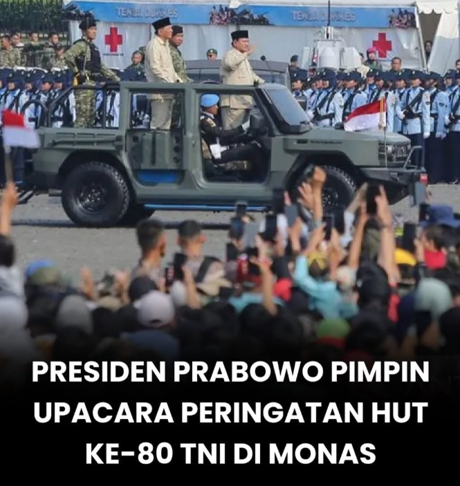 Presiden Republik Indonesia Prabowo Subianto tiba di Monumen Nasional (Monas), Jakarta Pusat, Minggu pagi, untuk bertindak sebagai inspektur upacara dalam peringatan Hari Ulang Tahun (HUT) ke-80 Tentara Nasional Indonesia (TNI). Sebelum memasuki lapangan upacara, Presiden Prabowo menyapa masyarakat dari Istana Merdeka menuju Monas dengan menggunakan kendaraan taktis Maung Putih Garuda melalui Jalan Medan Merdeka Barat. Tiba tepat pukul 08.00 WIB, Presiden langsung menuju mimbar kehormatan dan disambut oleh Wakil Presiden Gibran Rakabuming Raka beserta jajaran pejabat tinggi negara. Kehadiran Presiden disambut antusias ribuan undangan dan masyarakat yang turut menyaksikan momentum bersejarah tersebut. Usai Presiden menempati mimbar kehormatan, upacara resmi dimulai dengan pengibaran Sang Saka Merah Putih yang diiringi lantunan lagu kebangsaan Indonesia Raya.